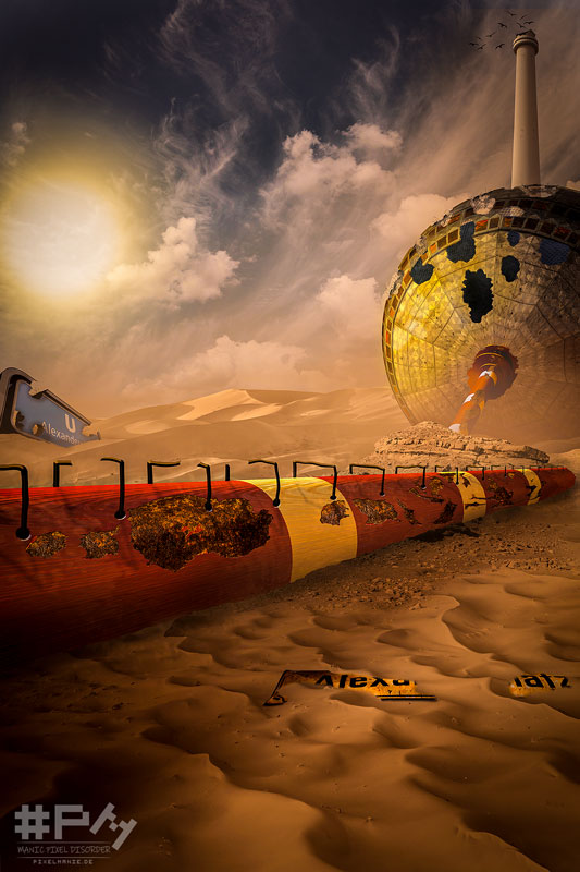Realisiert mit den 3D Funktionen von Photoshop (Kugel + Sendemast) und diversen Stockfotos von Fotolia (Himmel, Wüste, U-Bahnstation). Das Bild hat in der Finalversion eine Dateigröße von 4 Gigabyte und 360 Ebenen.